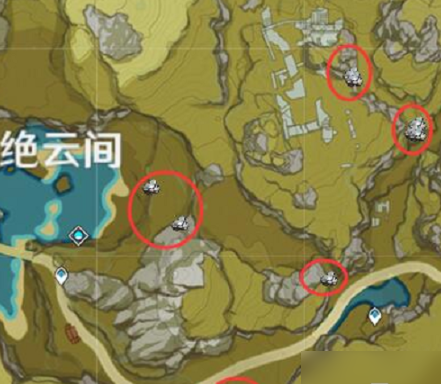 2、奥藏山矿群:该区域以层岩巨渊东南侧断崖为起点,沿山腰向东北延伸约200米范围内,密集分布着35个以上矿点。特别提醒此处常伴生夜泊石,建议携带凝光或钟离进行协同开采。