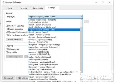 3、在参数设置窗口中找到"Language"分类标签,展开下拉菜单后会显示支持的多国语言列表,滑动滚动条定位到"Chinese"条目