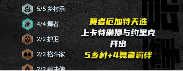 2、羁绊效果解析:激活5乡村音乐+4舞者双核心体系,辅以2护卫+2格斗家+2裁决使构成复合型增益网络。乡村音乐羁绊可周期性召唤战马助战,同时提供全员攻速加成与吸血效果,显著提升阵容持续作战能力。
